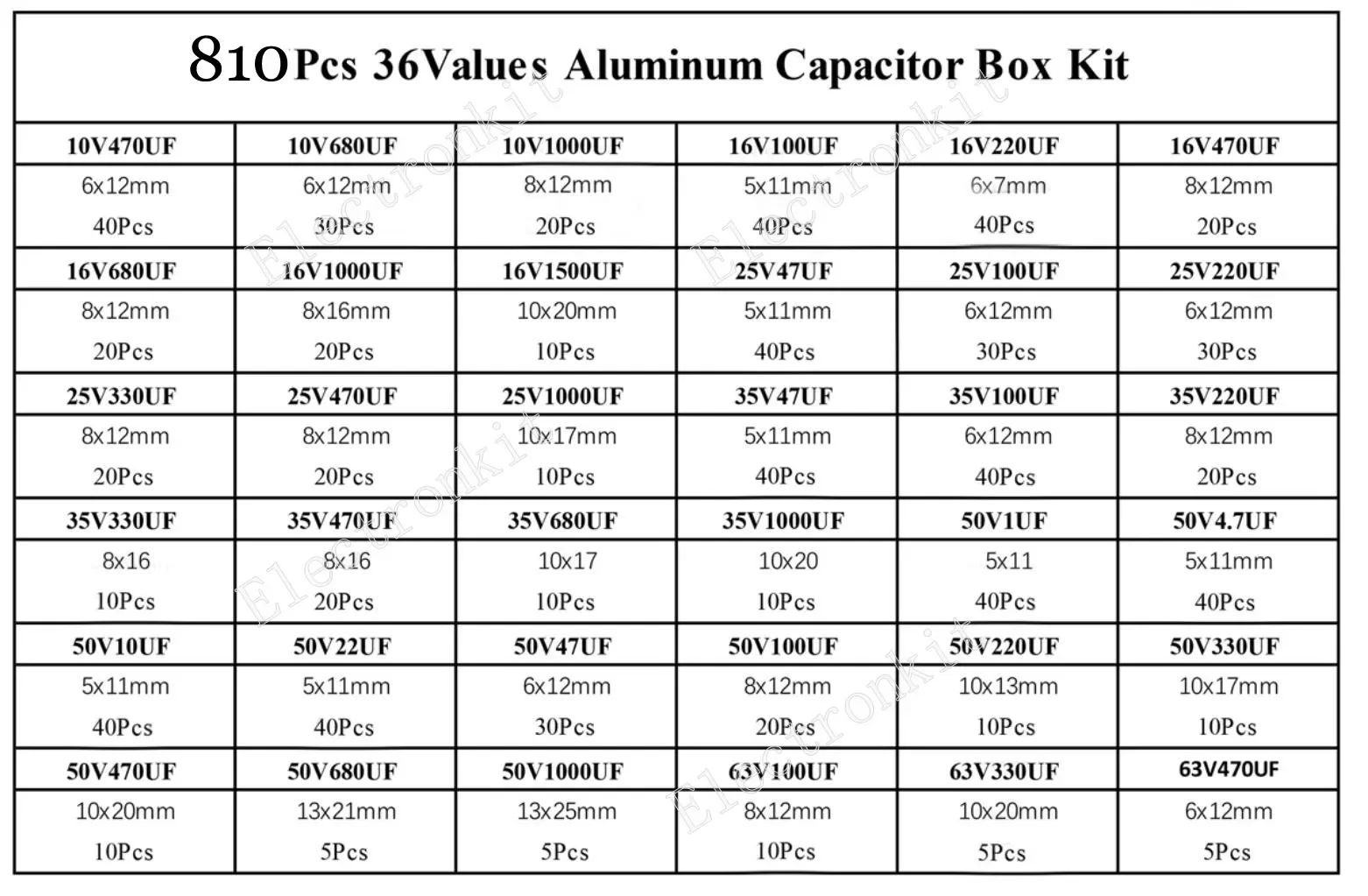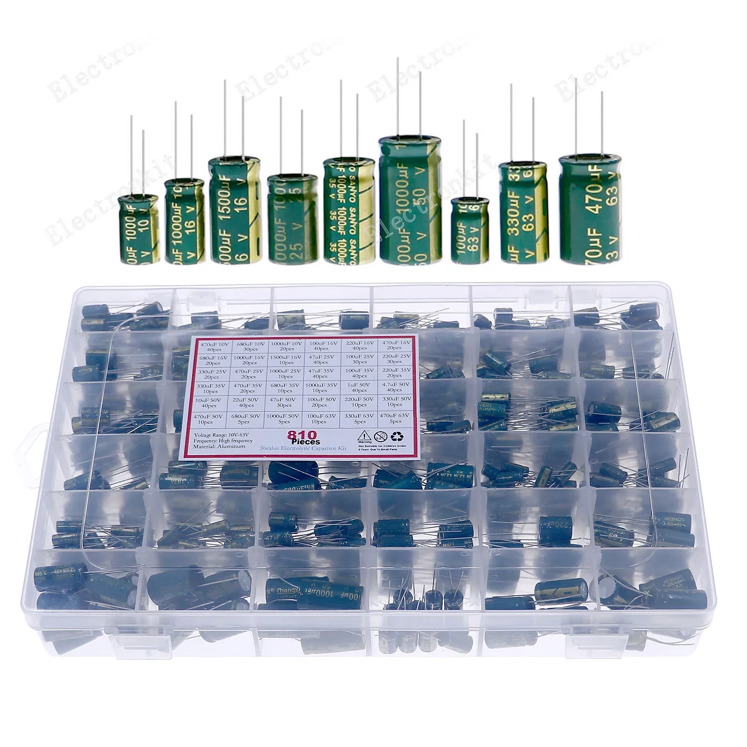 810Pcs 36Values Green Aluminum Electrolytic Capacitor set 10V 25v 35v 50v 63V 1u