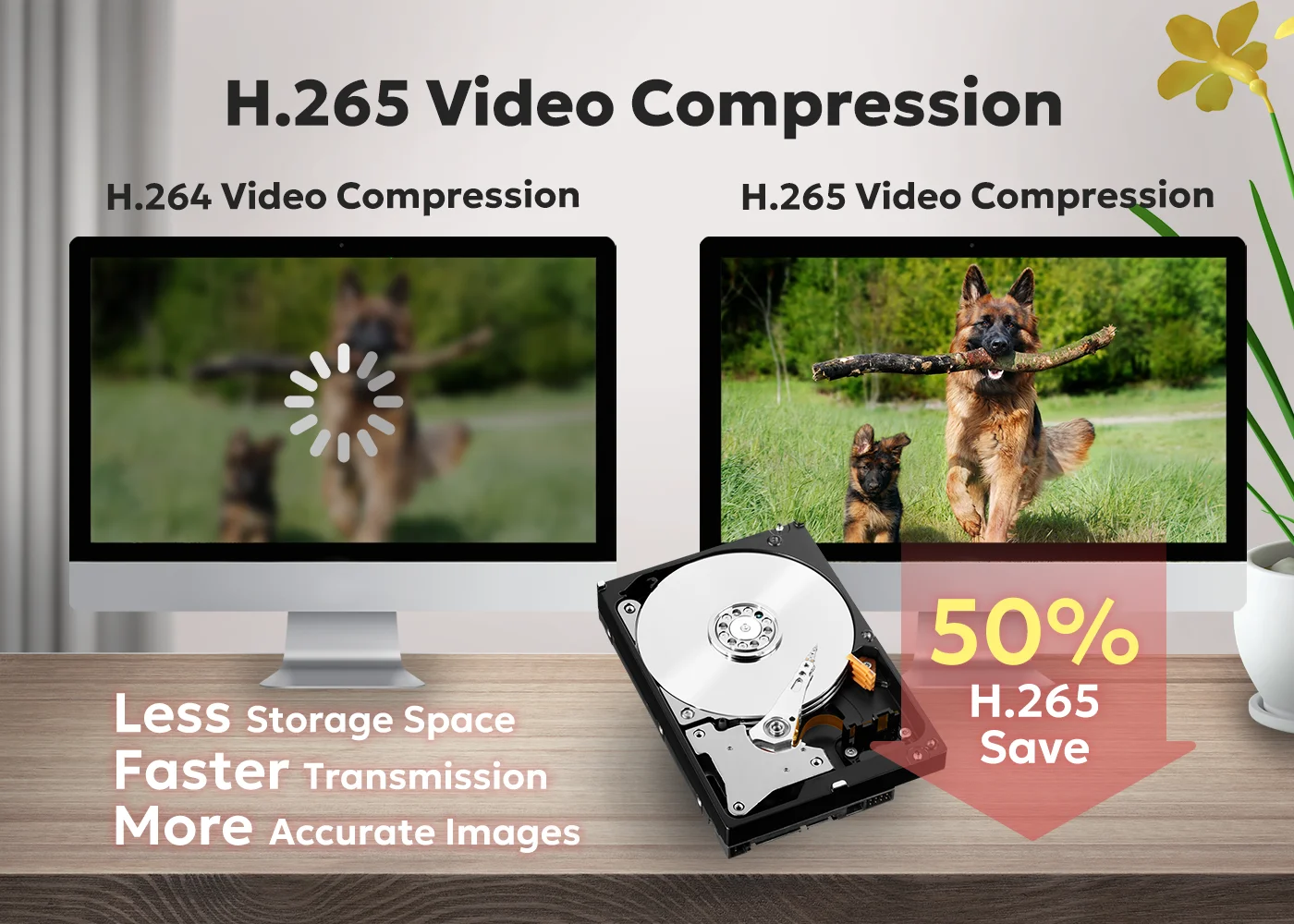 The H.265 Video Compresion, which allows you to save up to 50% of your HDD storage space, loads faster and plays videos more smoothly.