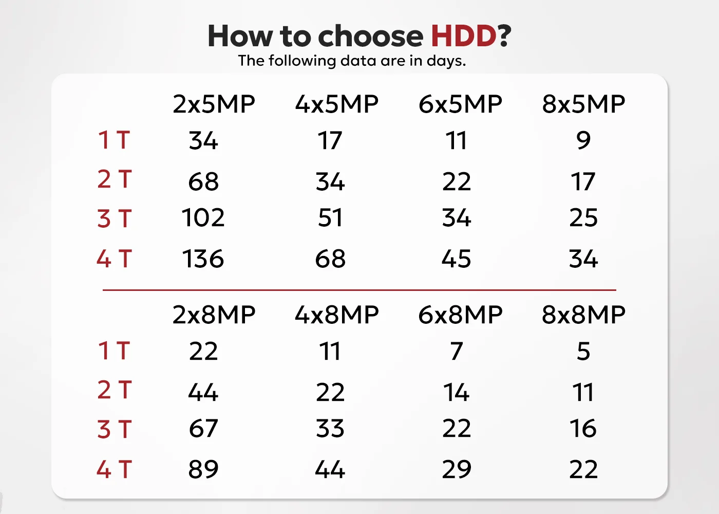 The following pictures introduce the number of recording days supported by HDDs of different capacities, you can buy them according to your needs.