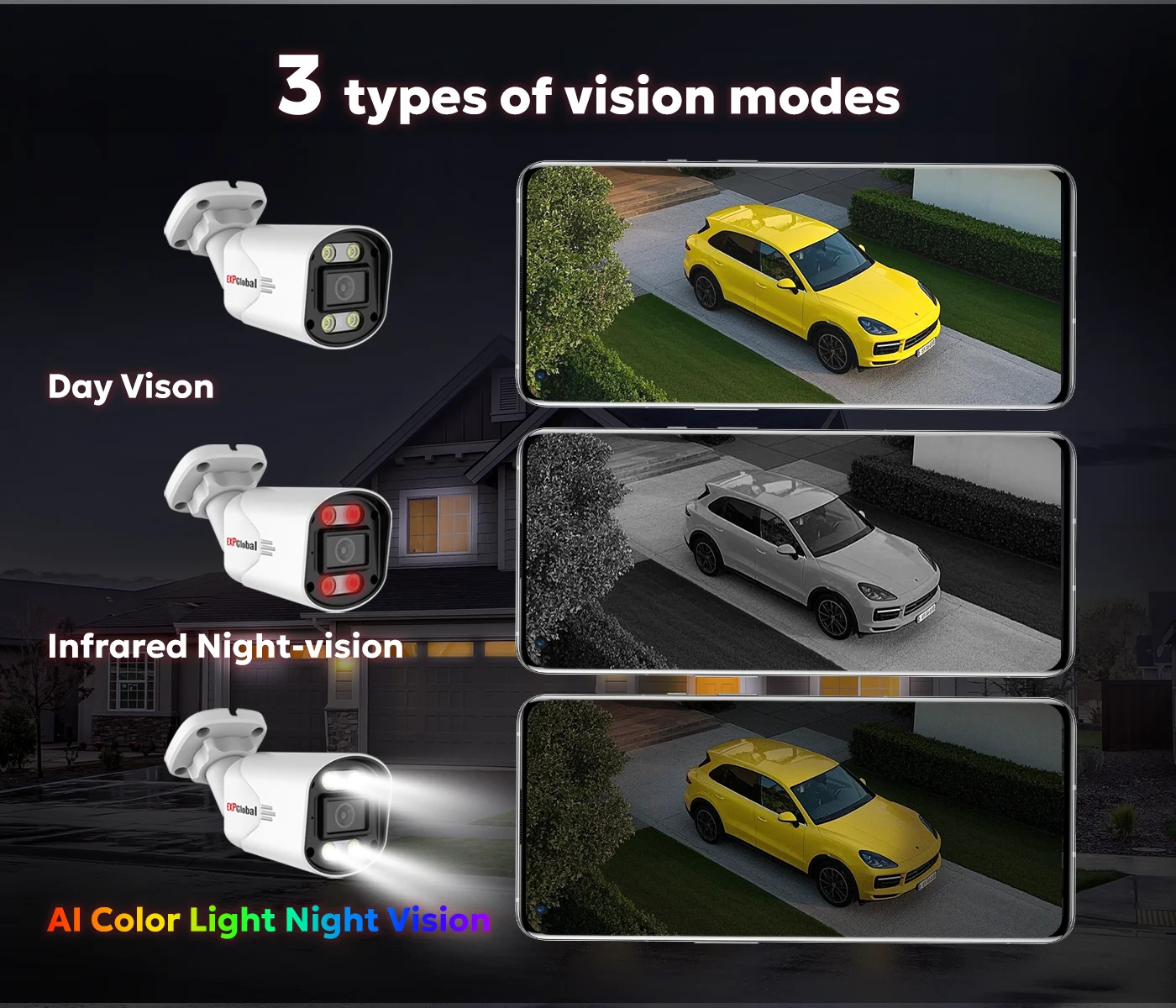 3 types of vision modesOur Camera Support 3 types of Vision modes.At night, you can chose Infrared night-vision, AI smart Color Light Night vision, Full color Night Vision.