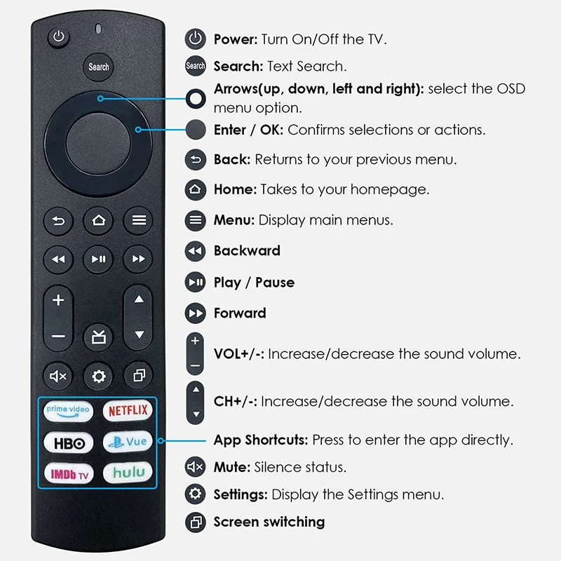 Replacement IR remote compatible with Toshiba and Insignia Fire Smart TV CT-RU1US-21, NS-RCFNA-21, NS-RCFNA-20, CT-RC1US-19, NS-RCFNA-19, 2nd gen l5b83h.
