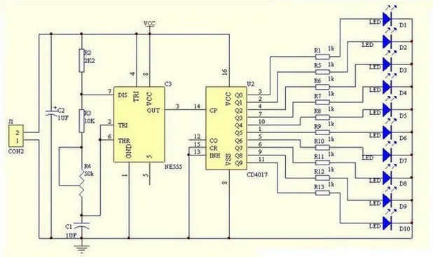 This package is mainly decimal counter circuit and circuit generated by the clock , from the core of the self-excited NE555 multivibrator power through R2, R3, R4 charge the capacitor C1, C1 started when charging , NE555 2 feet still in low, so the output pin 3 goes high when power through R2, R3, R4 to charge C1 to 2/3 of the supply voltage , the output pin 3 level from high to low , NE555 conducting internal discharge , capacitor C1 through R4, R3, NE555 7 feet discharge until the voltage across C1 is less than 1 /3 of the supply voltage , NE555 and 3 feet level from low to high . C1 and charge again this cycle oscillations formed . Charging time : 0.695 (R2 + R3 + R4) C1, discharge time : 0.695 (R4 + R3) C1, R4 can be adjusted to control the output frequency of the oscillator , the oscillation clock signal is applied continuously NE555 CD4017 14 feet , the output terminal 10 is connected with the CD4017 10 LED, when the output terminal 10 turns CD4017 generated clock signal is applied at a high level , the D1 - D10 are sequentially lit to form a water -light effect .