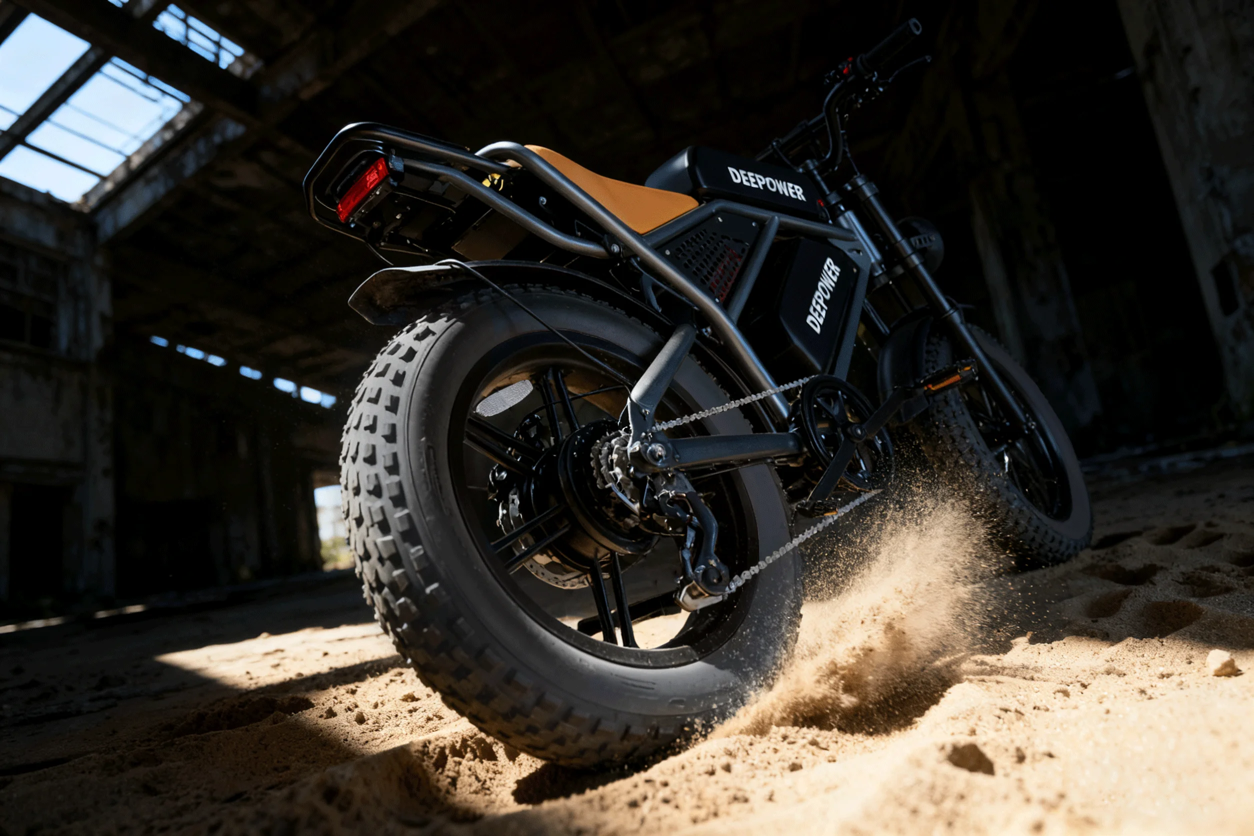 It boasts a distinctly rugged off-road aesthetic. The body features a predominantly black finish paired with tan seats, creating a striking visual contrast. Its most distinctive feature is the massive 20-inch 4.0 off-road tires with bold tread patterns, kicking up clouds of sand during desert traversals to showcase both raw power and exceptional off-road capability.